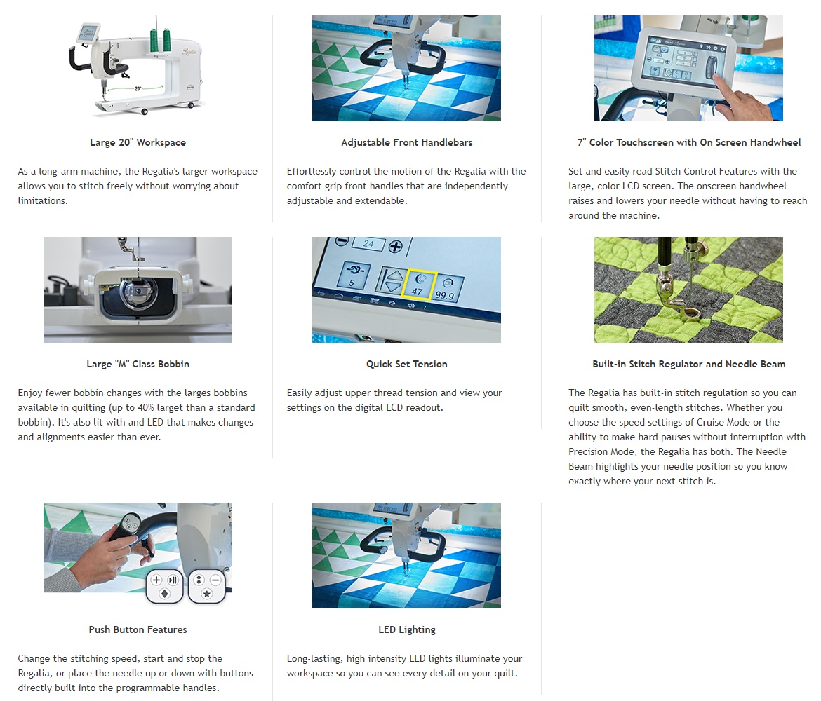 • Can use patterns, stencils, threads, 1/4" thick rulers and templates that commercial quilters use