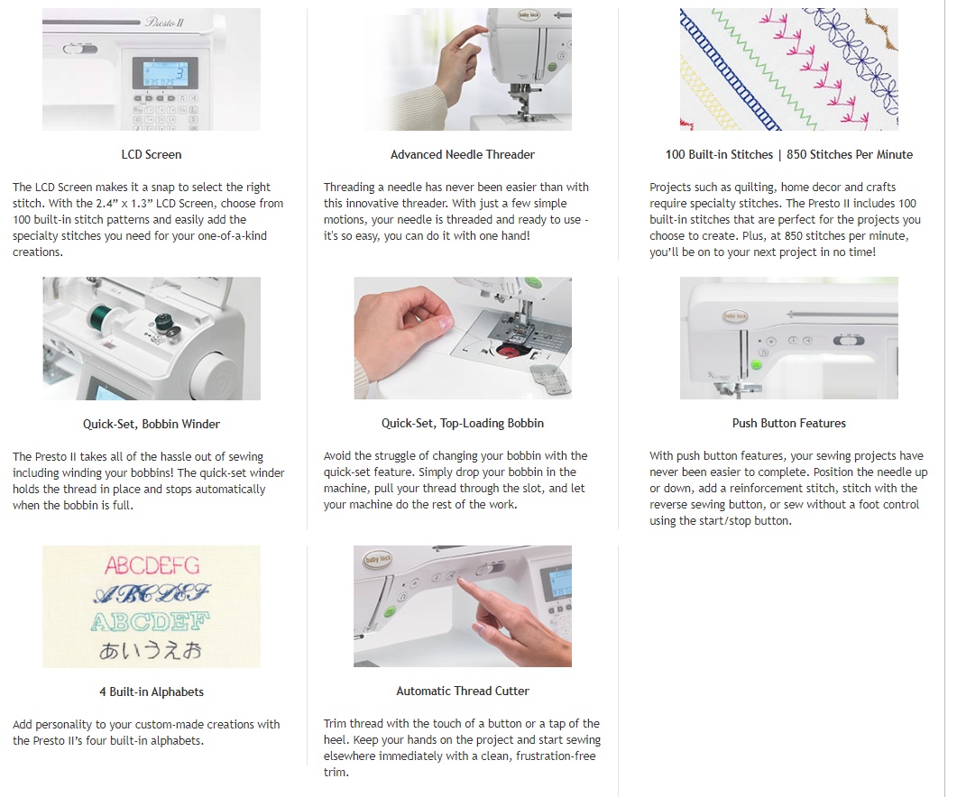 With its user-friendly controls, incredible versatility, and effortless precision, the Baby Lock Presto 2 makes quilting and sewing fun, fast, and frustration-free
