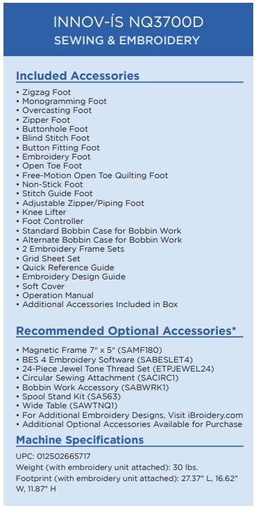 Embark on your embroidery journey with the Innov-ís NQ1700E, the perfect machine for personalization, embellishment, and effortless creativity! With premium features, intuitive controls, and a generous ...