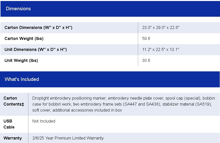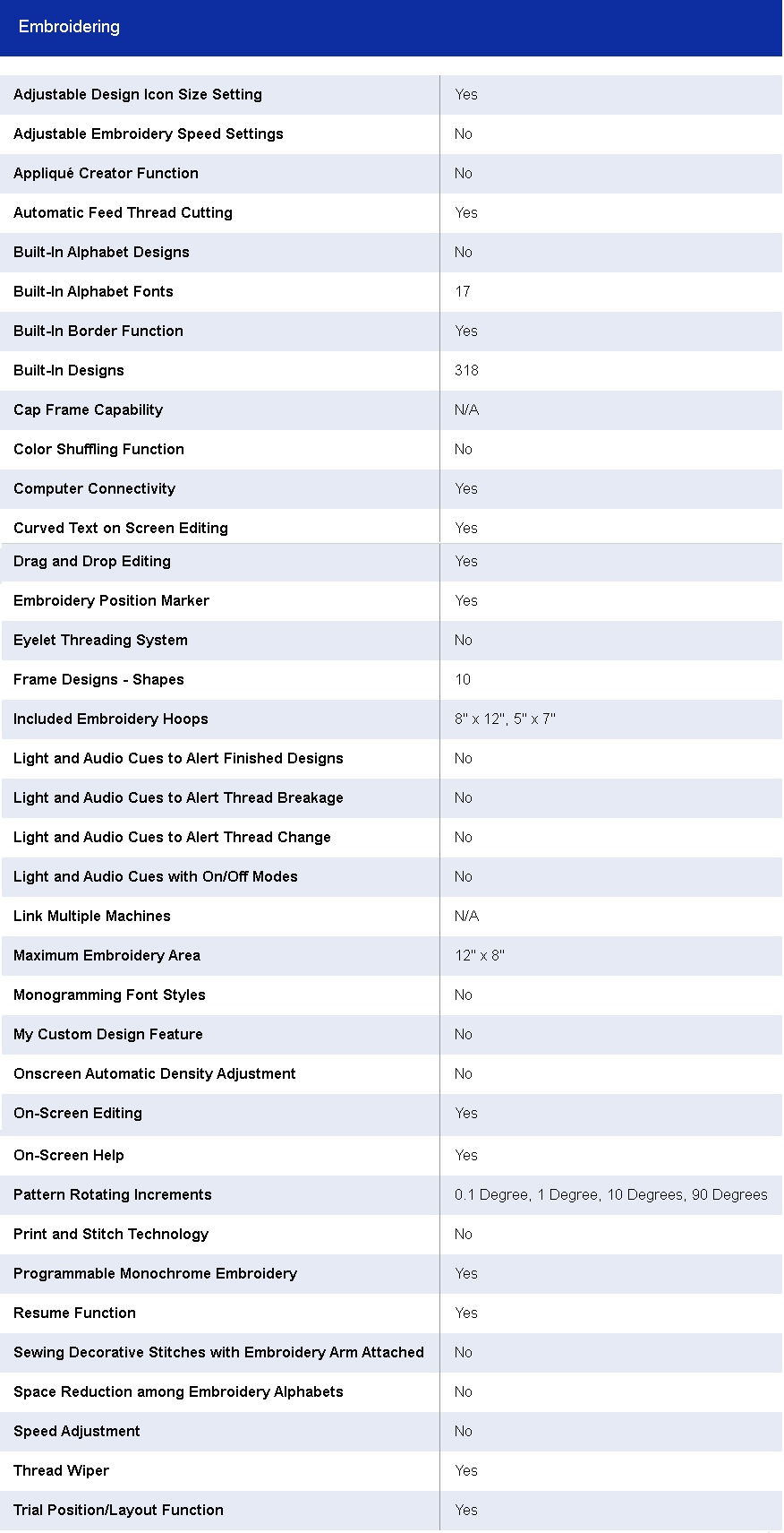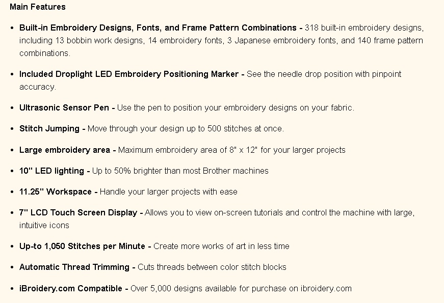 With the freedom and flexibility of touch screen technology, your machine becomes an extension of you, enabling you to achieve a whole new level of creativity. The addition of 318 embroidery designs -- including 13 bobbin work designs, 17 embroidery fonts, and 140 frame pattern combinations -- allows you to create almost anything you can dream up. The stitching velocity reaches up to 1,050 SPM, allowing your projects to come to fruition faster and giving you the ability to spend more time creating and less time working. See your work clearly with the 10” bright LED lighting. Express yourself in an intuitive, creative, and fun way with the all-new Innov-ís VE2300 from Brother.
