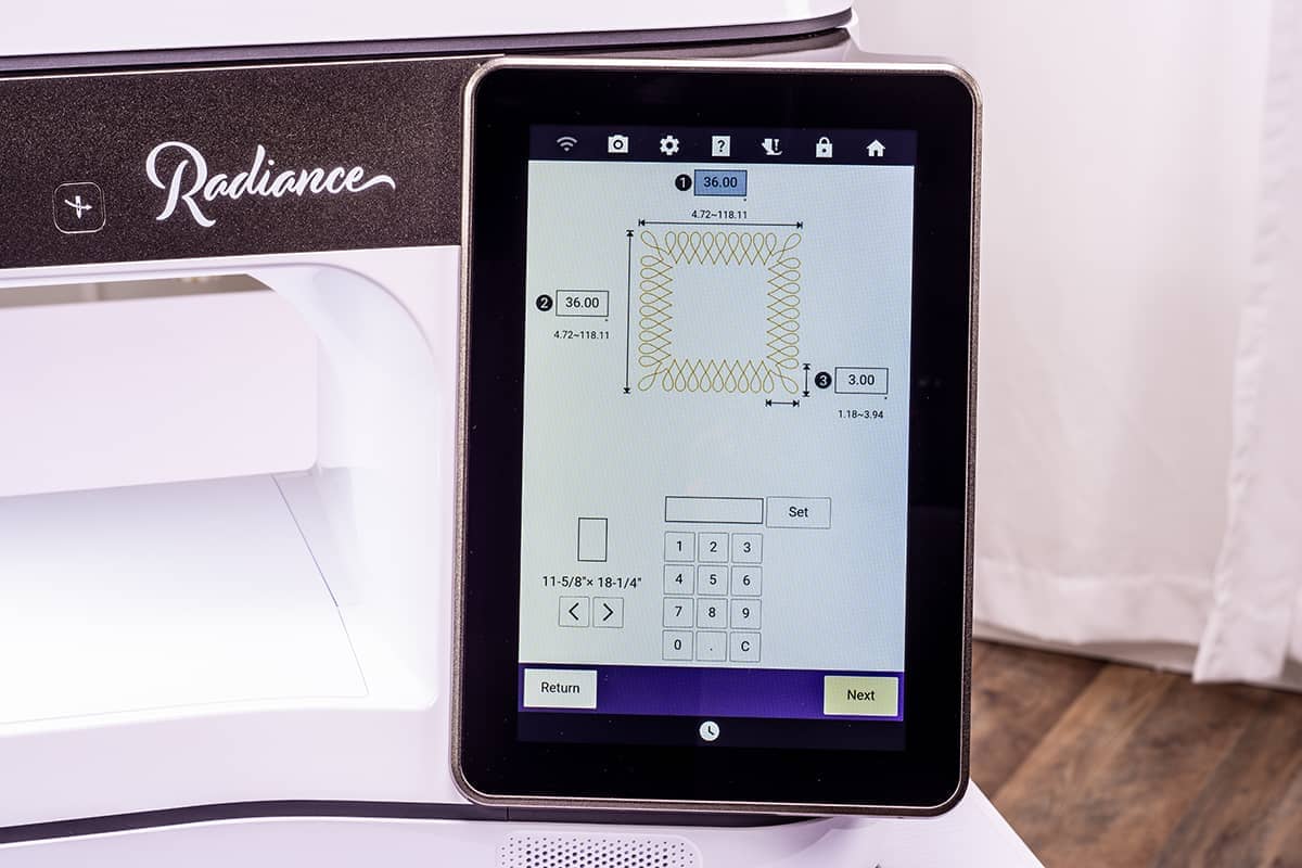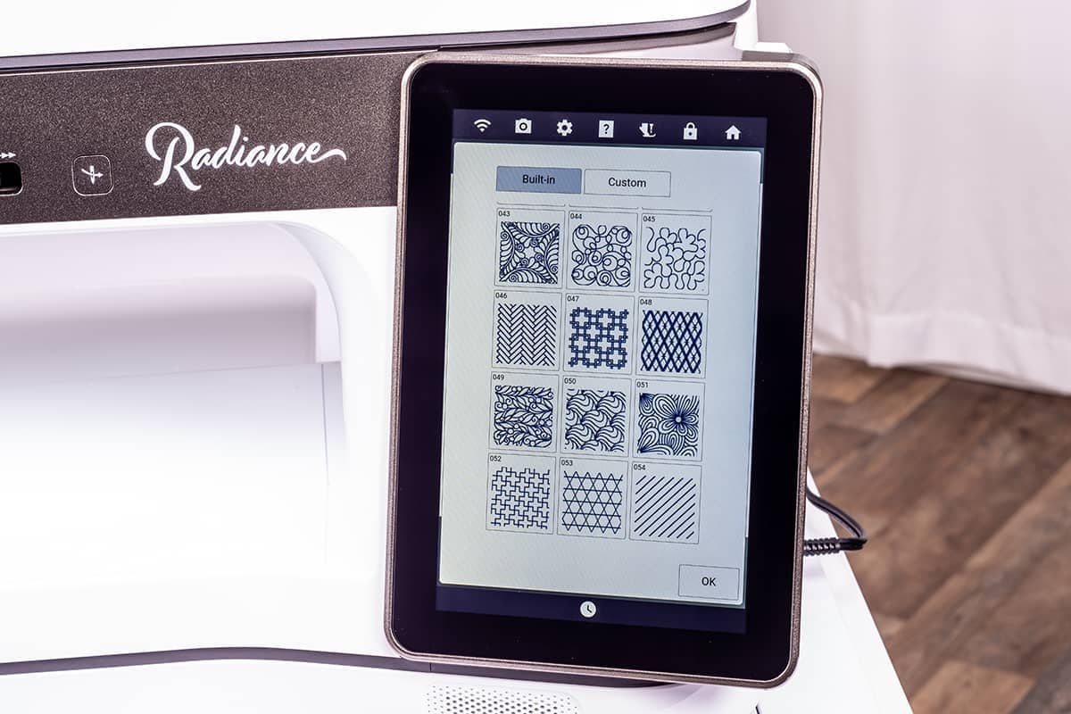 Create beautiful edge-to-edge quilting projects using the 15 built-in patterns. Enter a few measurements, select a hoop, specify flip options, and the Radiance sets up your entire quilt. The on-screen instructions and design projections guide you every step of the way for quilts measuring up to 118″ x 118″. Use the optional 10″ x 10″ magnetic quilting and embroidery frame for easy quilting across your entire quilt.