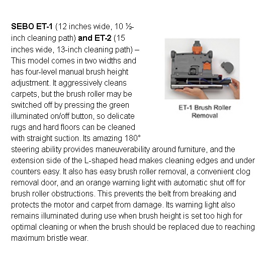 Made in Germany, SEBO power heads are recognized worldwide as the most reliable and best designed on the market. They effectively clean most types of flooring surfaces, have excellent pet hair removal and are virtually maintenance free! They feature warning systems that assure consistently effective brush agitation and provide automatic shut off, if an obstruction jams their brush rollers, which protects the belts, motors and carpets from damage. And removing their brush rollers is quick and easy, so they can be cleaned or replaced if the bristles are worn.