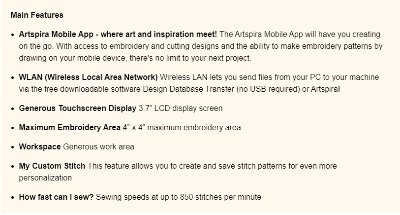 - Artspira Mobile App Compatibility – Draw custom embroidery designs on your phone and transfer them wirelessly.
