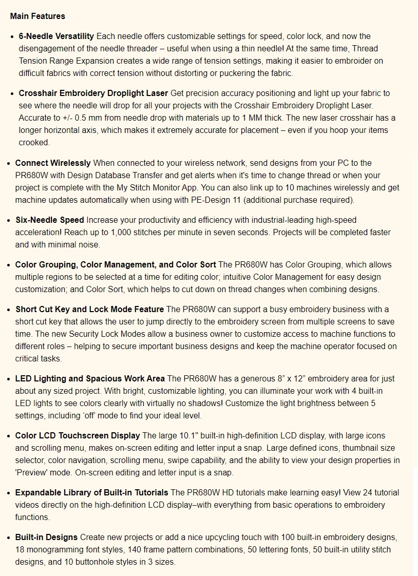 With 100 built-in embroidery designs, 18 monogramming fonts, 140 frame patterns, 50 lettering fonts, and 10 buttonhole styles, the PR680W ensures every stitch is a masterpiece.
