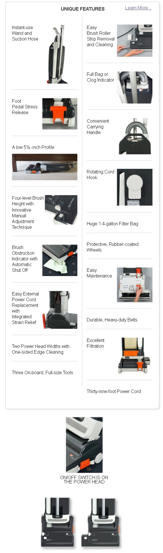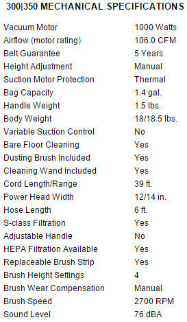 The 300 and 350 MECHANICALS were designed to clean carpets, perform well on most hard floors, and have superb pet hair removal! They have a convenient instant-use cleaning wand and suction hose with an eight-foot reach and three on-board tools. The four-level manual height adjustment can be conveniently changed with the aid of the cleaning wand. Plus, the machine turns off automatically and gives user notification when a brush roller obstruction occurs, which protects the belts and carpets from damage. There is also user notification when a full bag or clog occurs. Additional features include excellent filtration, a giant 1.4-gallon bag, 39-foot cord, protective rubber-coated wheels, a low 5 ½-inch horizontal cleaning profile that fits under beds and furniture, and tool-free brush strip removal for bristle cleaning or replacement.