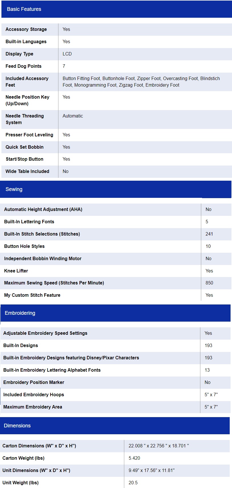 • 193 built-in embroidery designs + 241 sewing stitches, 13 embroidery fonts, and 10 styles of auto-size buttonholes = endless ways to personalize your projects!